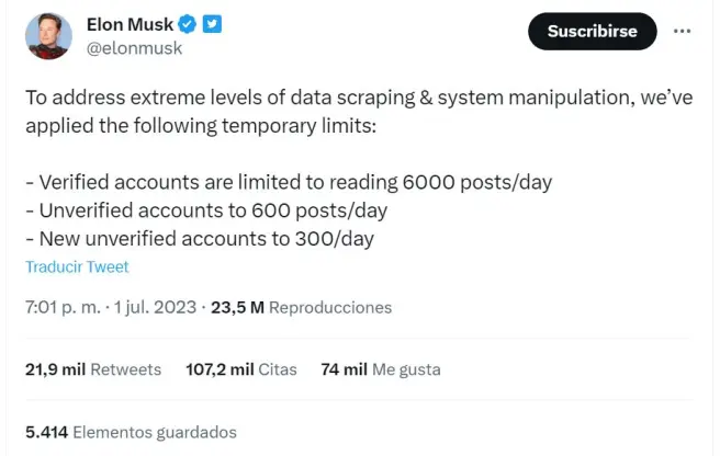 Recientemente, Musk anunció que Twitter limitará temporalmente el número de publicaciones que los usuarios pueden leer por día, como respuesta a las preocupaciones sobre la extracción de datos. Esto se produjo después de que miles de usuarios informaran problemas al usar la plataforma y recibieran mensajes de error de que habían "excedido" su "límite de velocidad". Musk no ha especificado cuánto tiempo durarán estas limitaciones ni qué podría llevarlo a levantarlas. Inicialmente, se estableció un límite de 6,000 publicaciones por día para cuentas verificadas, 600 para cuentas no verificadas y 300 para nuevas cuentas no verificadas, pero posteriormente los límites se incrementaron a 10,000, 1,000 y 500, respectivamente.